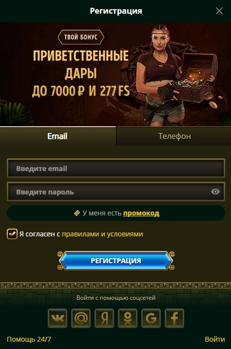 - Регистрация через социальные сети. Игрок выбирает желаемый сервис и авторизуется на сайте через него.