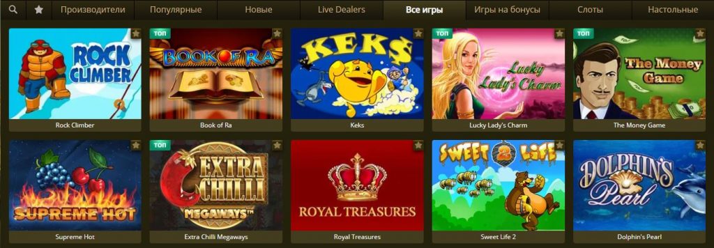 В разделе «Игровой зал» игры по умолчанию группируются по производителям. Также имеется разбивка на новые и популярные игры, возможность выстроить все тайтлы по алфавиту, реализован поиск по названию.