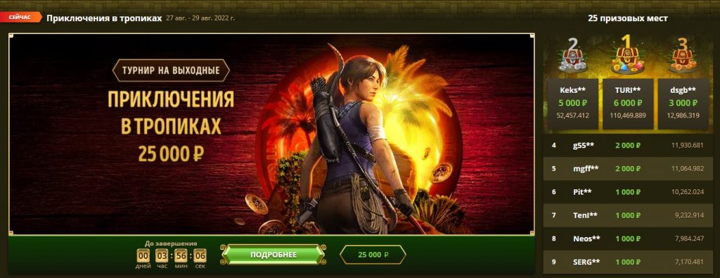 В казино Эльдорадо регулярно проводятся турниры. Наградой для победителей являются бесплатные фриспины или денежное вознаграждение. С правилами проведения конкретного турнира можно ознакомиться в разделе “Турниры” нажав на кнопку “Подробнее”.