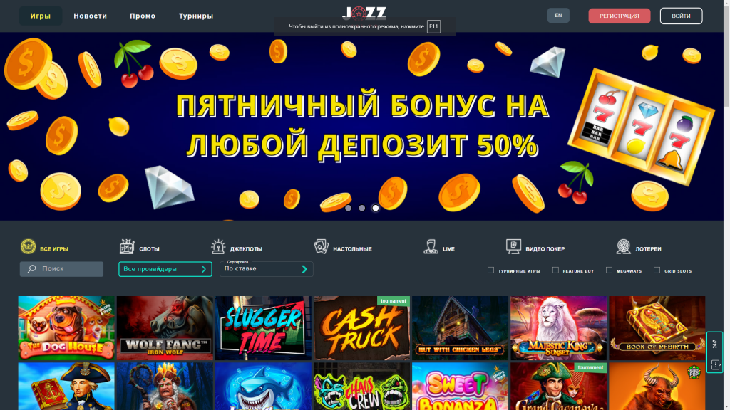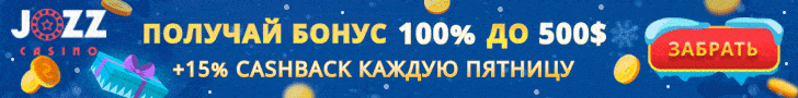 В пятницу в казино Jozz действует специальная акция – 50% от любого депозита начисляется на Бонусный счет. Вывести эти средства на Реальный баланс можно только после отыгрыша по вейджеру х40.