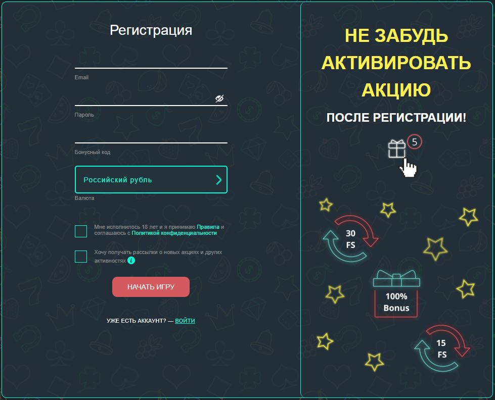 В окне регистрации пользователю любезно напоминают об активации приветственного бонуса, в рамках которого доступны фриспины и денежные подарки.