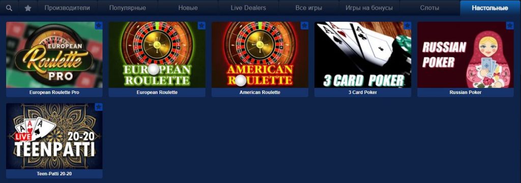 Для любителей настольных азартных игр, на сайте представлен специализированный раздел, игрокам доступны несколько вариантов рулеток и покера.